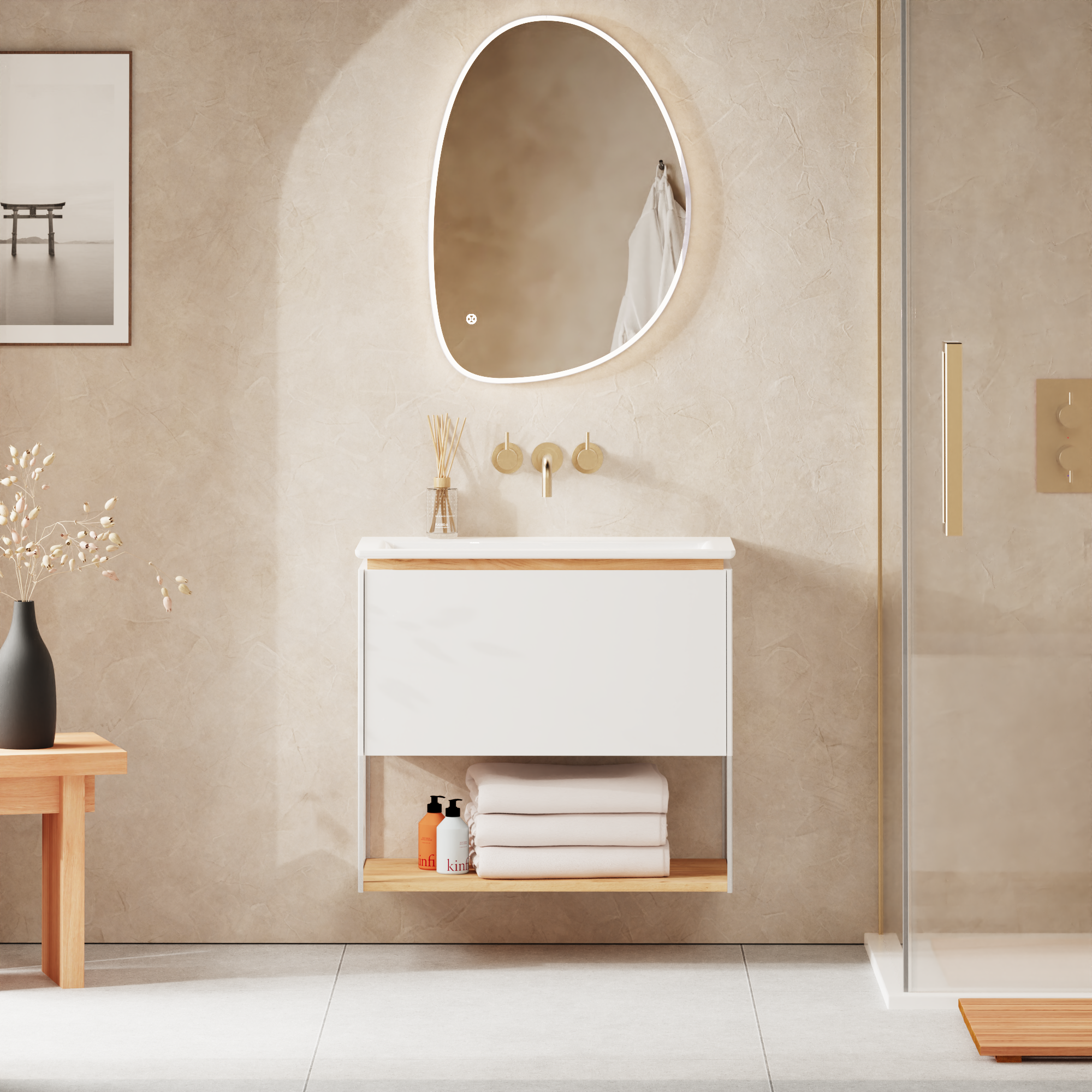 Mada is a collection of vanities and mirrors designed to balance precision with nature. The vanities pair clean vertical lines with a discreet horizontal oak detail, while a powder-coated aluminium undermount shelf maintains the minimalist aesthetic and provides practical storage. The mirror’s organic, pebble-like silhouette introduces an asymmetric calmness that softens the composition. Both pieces draw inspiration from Japanese design - from the quiet structure of torii gates to the wabi-sabi appreciation of subtle imperfection.